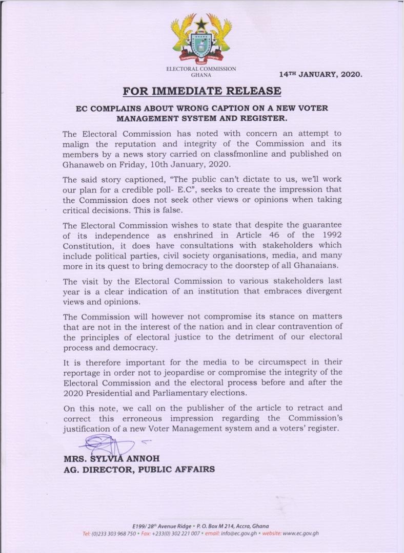 In a release dated 14th January, 2020 and signed by the Acting Director, Public Affairs, Mrs. Sylvia Annoh, the Commission however stated that it will “not compromise its stance on matters that are not in the interest of the nation,” cautioning the media to be circumspect in their reportage in order not to jeopardize the integrity of the Commission and the electoral process before and after the 2020 Presidential and Parliamentary elections.