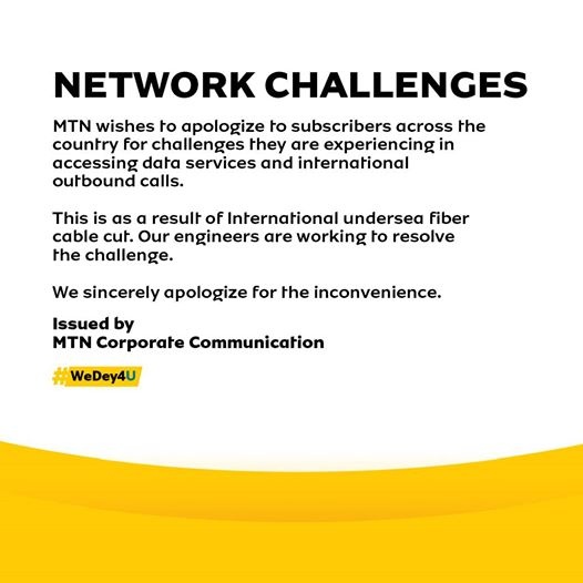 MTN blames the unsteadiness of the network and the inability of its customers to transact on the internet on “international undersea fiber cable cut” which engineers are working on resolve.