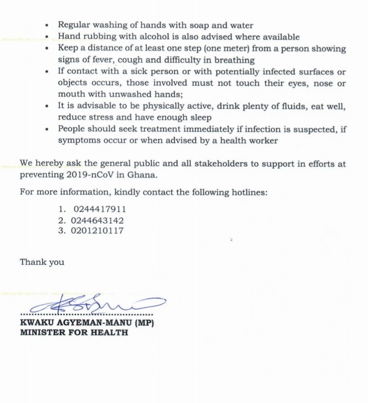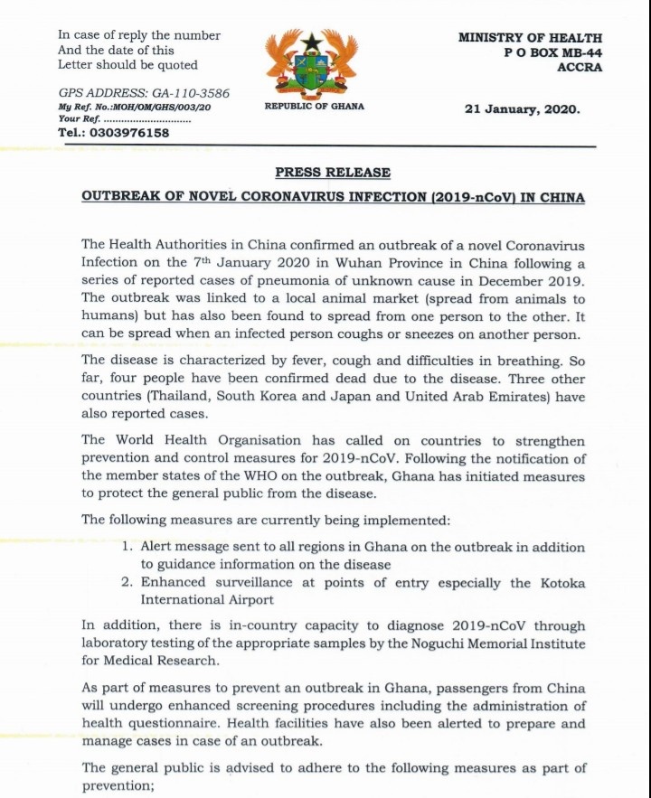 Ghana’s Ministry of Health has initiated measures to protect the general public from the outbreak of a Novel Coronavirus Infection (2019-nCoV) in China.