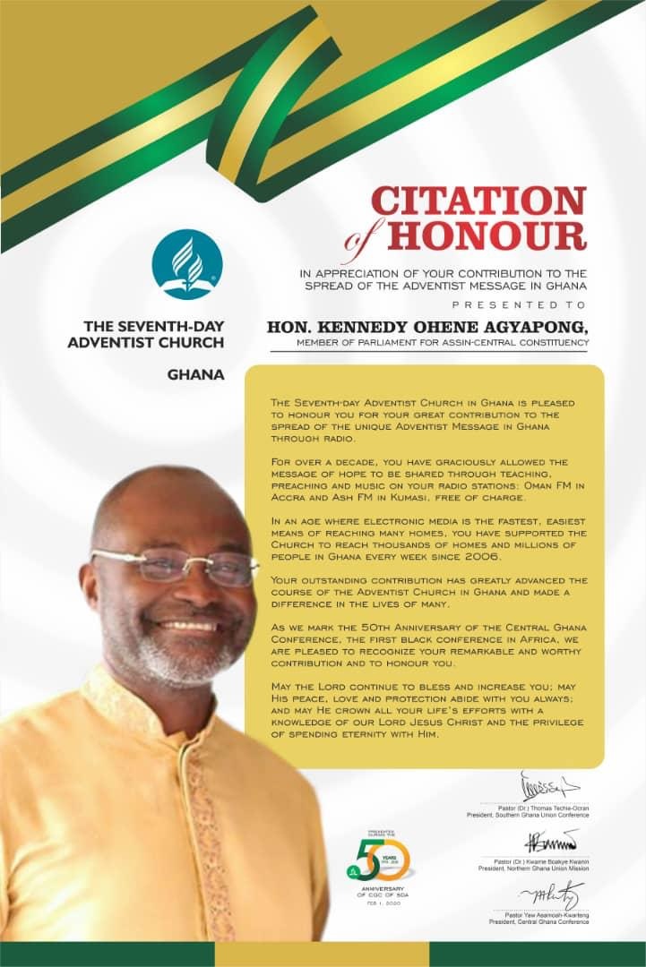 The Seventh-day Adventist Church, Ghana has honoured the Member of Parliament for Assin-Central Constituency, Hon Kennedy Ohene Agyapong for his “contribution to the spread of the Adventist message in Ghana.”