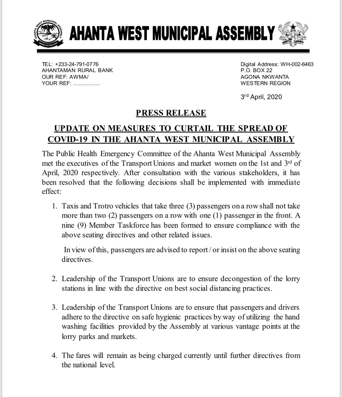 “Taxis and Trotro vehicles that take three (3) passengers on a row shall not take more than two (2) passengers on a row with one (1) passenger in the front. A nine (9) Member Taskforce has been formed to ensure compliance with the above seating directives and other related issues,” part of the release dated April 3, 2020 said.