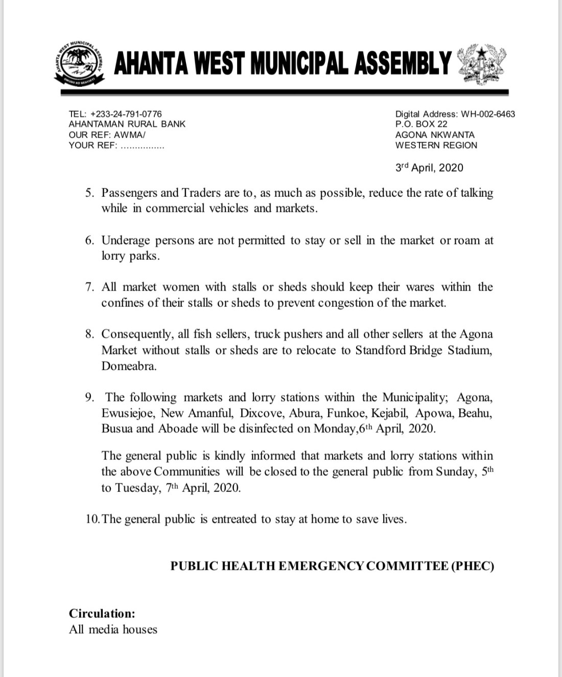 Markets and lorry stations in Agona, Ewusiejoe, New Amanful, Abura, Kejabil, Apowa, Beahu, Busua, and Aboade will be disinfected, thus, they will be closed down from Sunday, April 5, 2020 to Tuesday, April 7, 2020.